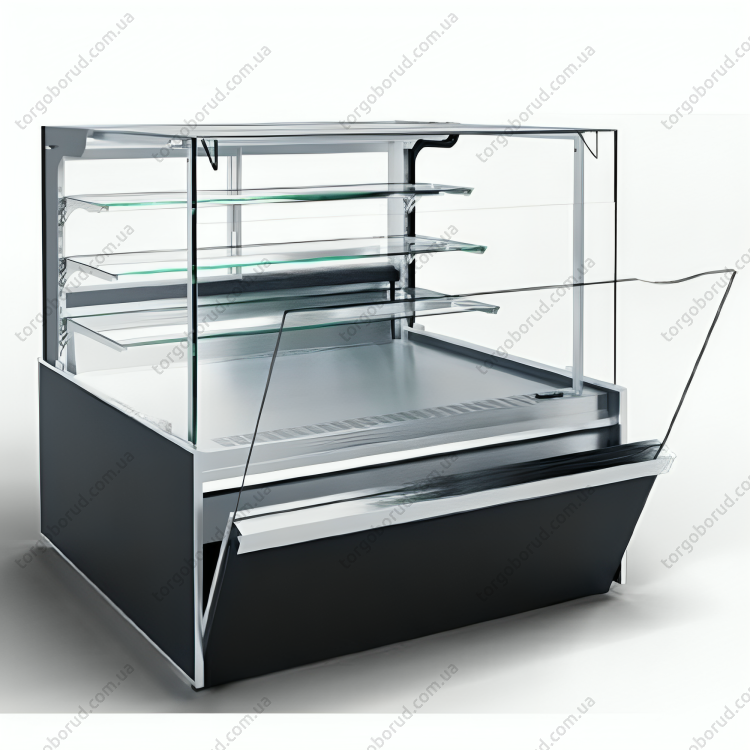 - 3 полки демонстрационные: 355мм; 430мм; 500мм - закаленное стекло; нижний уровень: выдвижной поддон 930мм - оцинкованная сталь с полимерным покрытием