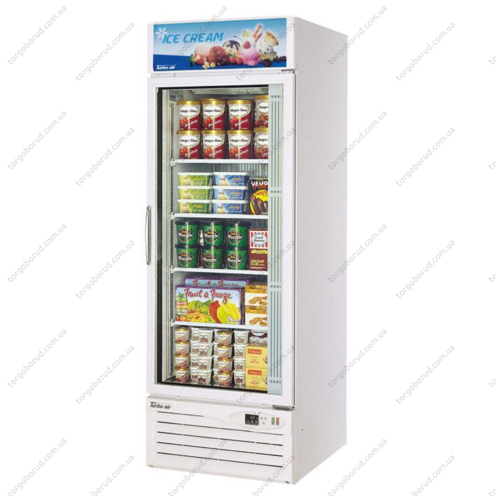 Морозильный шкаф Turbo air FRS-650F с одной стеклянной распашной дверцей. Предназначен для хранения и демонстрации продуктов и напитков на предприятиях общественного питания (в кафе, барах, ресторанах, магазинах, супермаркетах, торговых залах). Шкаф работает в режиме динамического охлаждения (используется хладагент R134a), имеет функцию автоматического размораживания (оттайки хитером с контролем температуры размораживания). Также применен механический тип управления. При незакрытой дверце срабатывает аварийный сигнал. Габаритные размеры установки - 686/756/1987 мм. -
