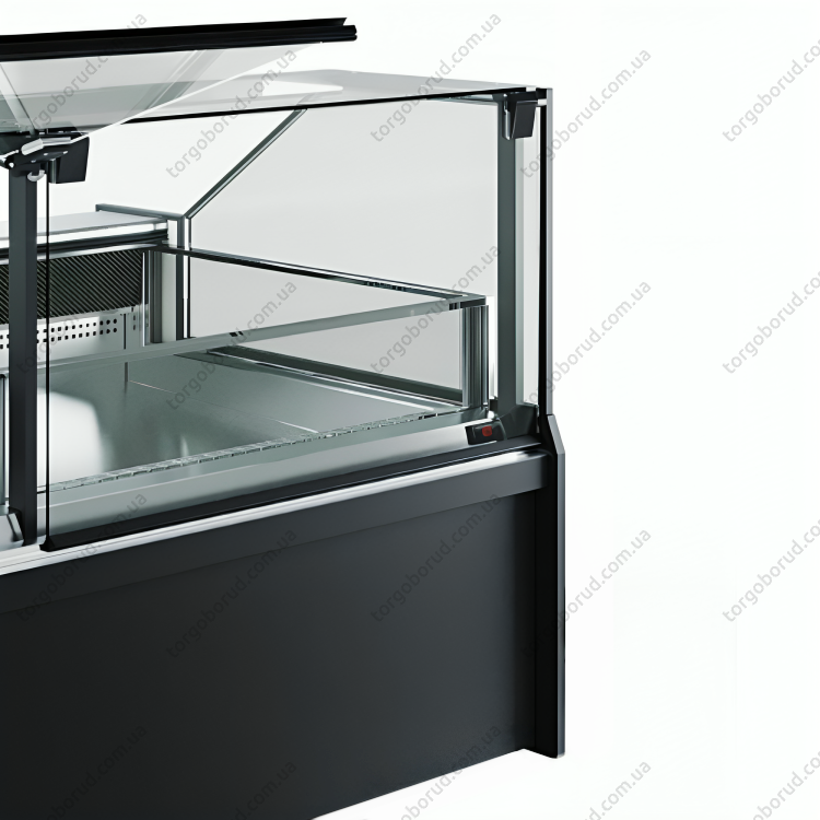 Фронтальное стекло с подъемом на газлифтах обеспечивает легкий доступ для персонала к товару и упрощает уборку витрины. Благодаря этому обслуживание становится удобным и безопасным.