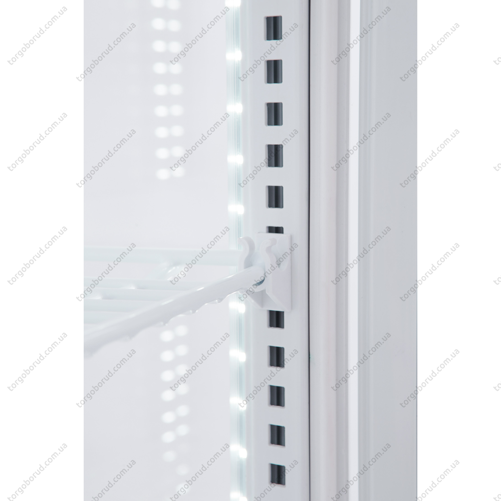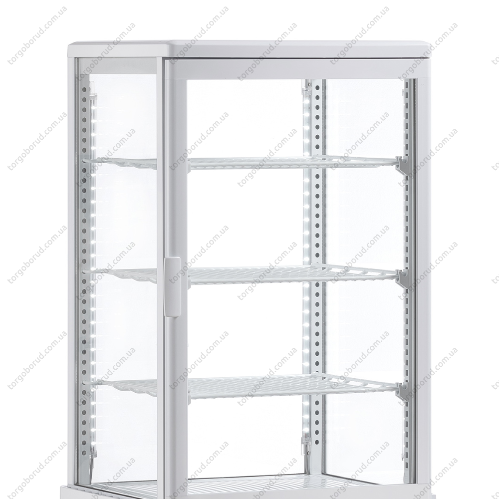 Камера комплектуется 3 полками, есть возможность регулировки их высоты. Нижним уровнем является несьемная полка. Присутствует подсветка LED (светодиодная). Полки выполнены также в белом цвете, ПВХ. Витрина GoodFood RT78L оборудована цифровой панелью управления. Охлаждение динамическое, осуществляется путем циркуляции холодного воздуха с помощью вентилятора.