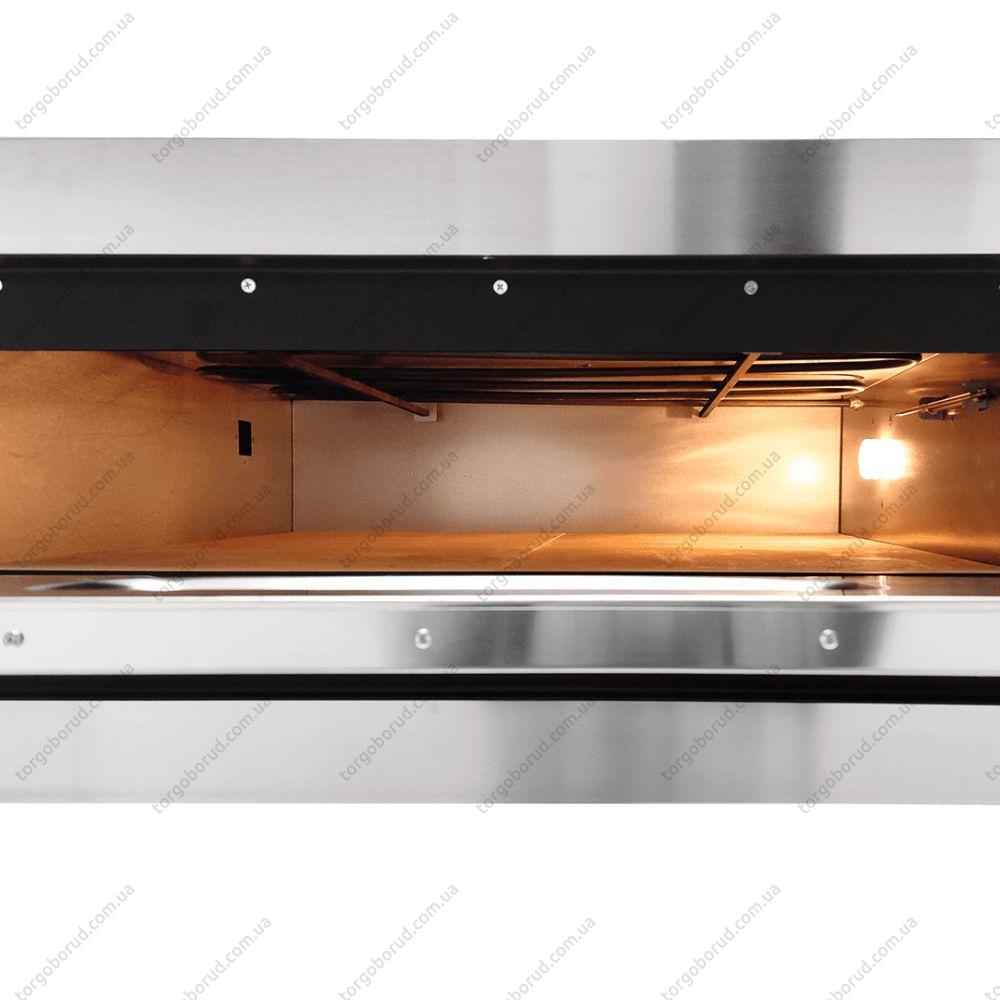 Специальные каменные плиты выложены на дне печи, что позволяет поддерживать высокую температуру в камере длительное время. Они удобно достаются и чистятся. Вместимость печи - 4 пиццы диаметром 36 см. Печь имеет электромеханическое управление. Материал изготовления лицевой панели из нержавеющей стали, рабочей камеры - сталь с алюминиевым покрытием.