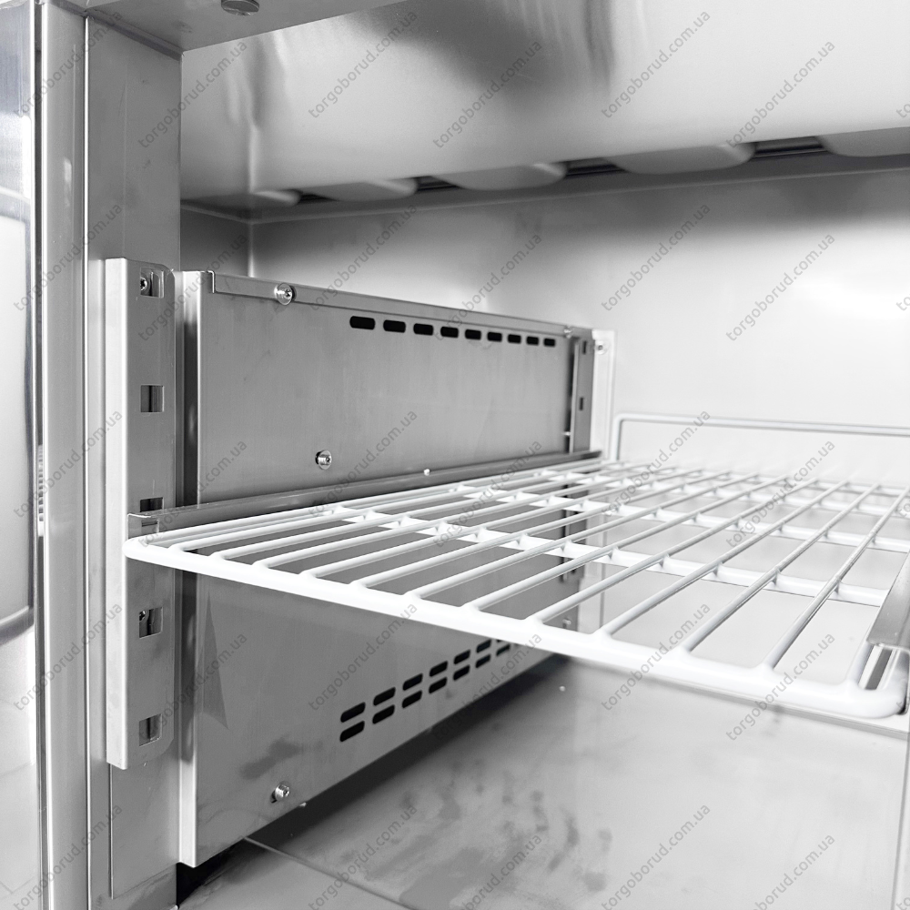 Стол комплектуется четырьмя полками: 2 размером 530×335 мм и 2 - 390×505 мм. Кроме того, в холодильной камере предусмотрено место для установки гастроемкостей: 5 GN1/6, 2 GN1/3 и еще одной GN1/6. Это позволяет удобно организовать ингредиенты в соответствии с потребностями кухни. Гастроемкости не входят в комплектацию поставки.