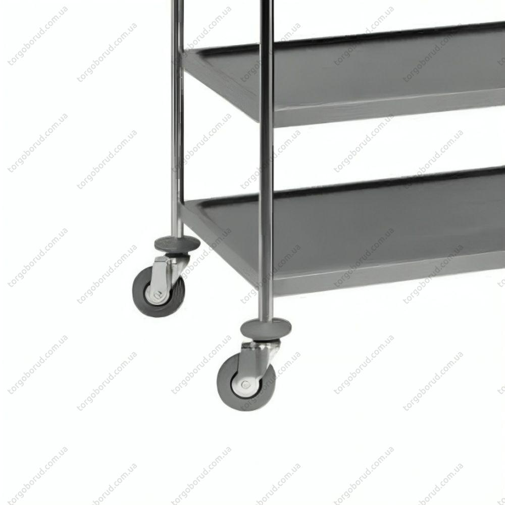 Оснащен четырьмя колесами, два из которых оборудованы тормозами, что обеспечивает легкое маневрирование и надежную фиксацию тележки во время остановок и загрузки.
