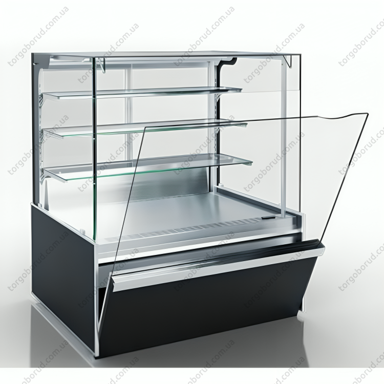 - 3 полиці демонстраційні: 300 мм; 355 мм; 430 мм - загартоване скло; нижній рівень: висувний піддон 700 мм - оцинкована сталь з полімерним покриттям