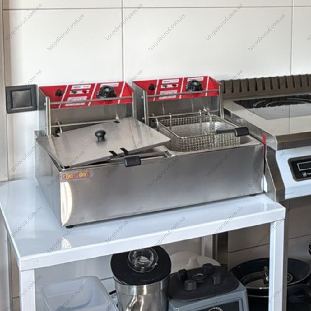Фритюрниця електрична GoodFood EF6+6 – надійний та функціональний апарат для приготування різноманітних страв, наприклад таких як: курячі крильця, нагетси, картопля фрі і багато іншого. Фритюрниці популярні на кухнях їдалень, ресторанів, готелів, закладах громадського зарчування тощо.