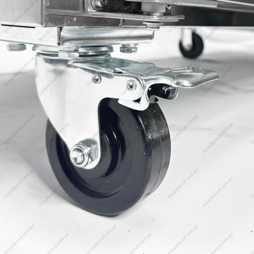 Система автоматичного випаровування конденсату полегшує догляд за холодильним столом, запобігаючи утворенню вологи та забезпечуючи чистоту в камері. Стіл оснащений 4 колесами, з яких 2 мають гальма для надійної фіксації на місці, що дозволяє зручно переміщувати стіл і закріплювати його в потрібному положенні.
