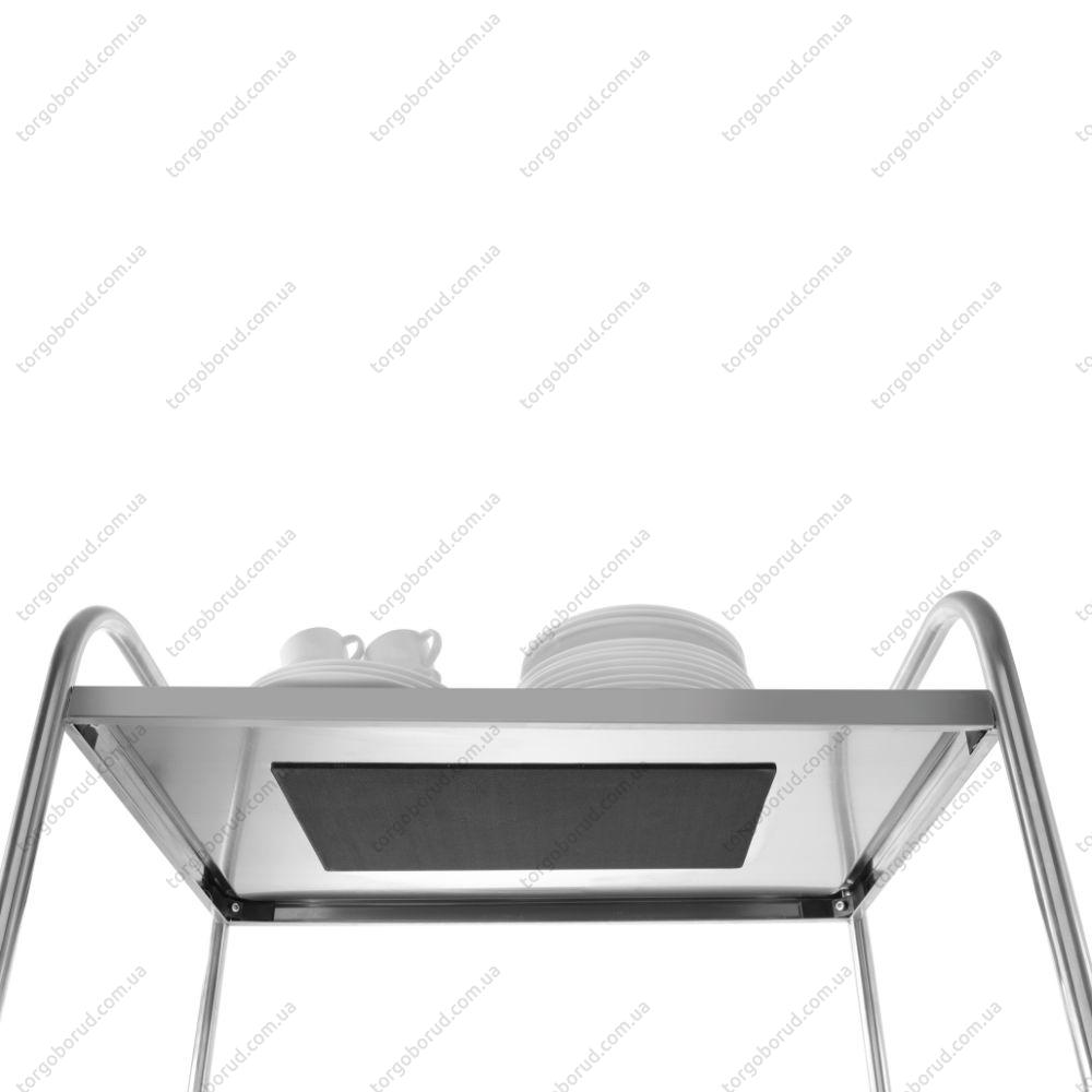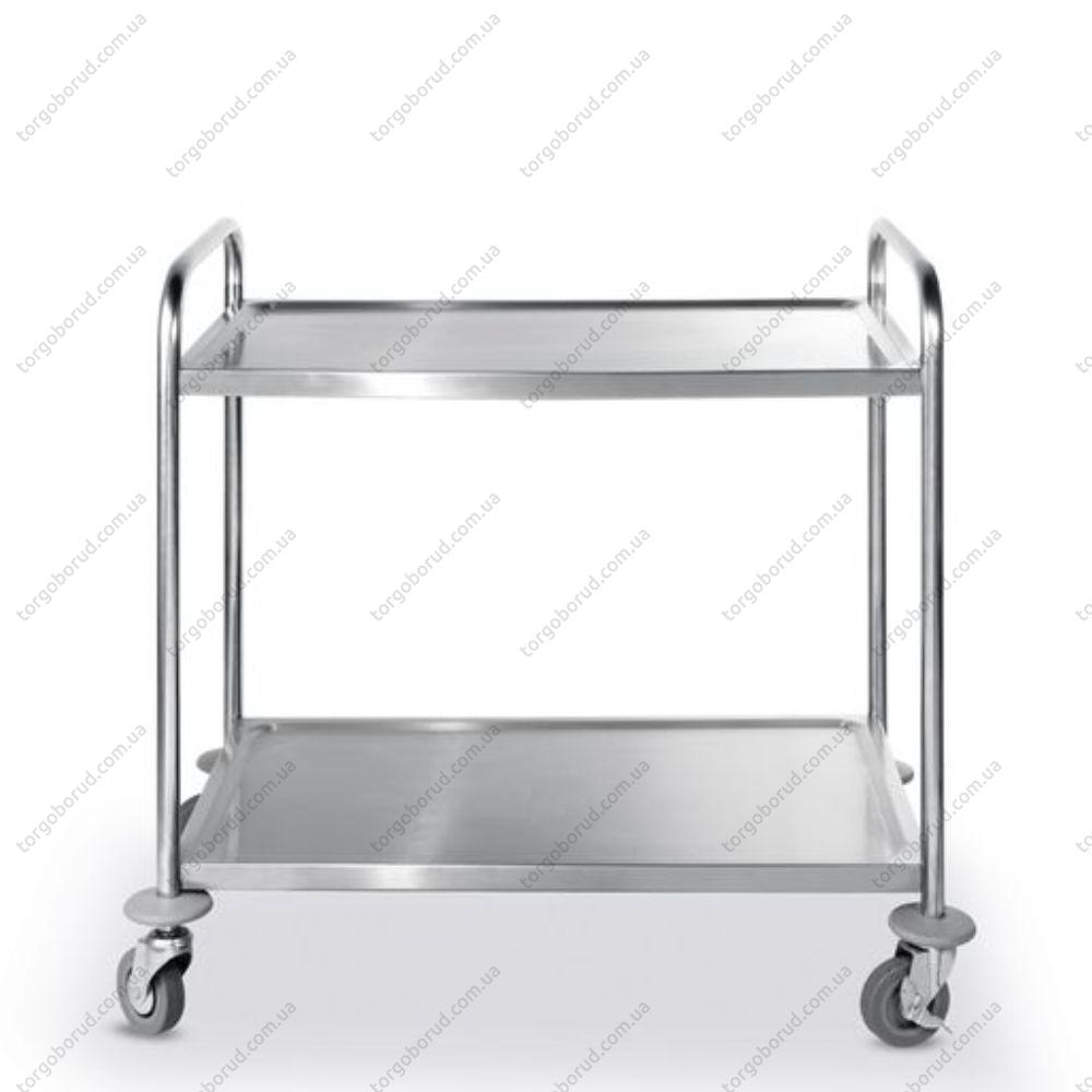 Візок виготовлений з нержавіючої сталі, стійкої до корозії та інтенсивної експлуатації. Оснащений двома полицями розміром 830 × 510 мм, під якими розміщений шумопоглинаючий матеріал для тихого пересування. Заокруглені краї підвищують безпеку під час роботи.